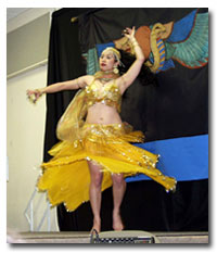 Preparation: The performance stage at the Swap Meet is raised (approx. three feet high), and the dimensions are approximately 8 feet by 12 feet. The stage is floored with smooth artificial wood and is usually comfortable for bare feet or shoes. There is no backstage area as such; once you are ready, you will be waiting next to the stage, often in view of at least some of the audience memebers. You will will need to go up a couple of steps to begin your performance. Please choose a choreography or routine that is suitable for this environment. For dance companies: There is no official limit on the number of dancers that can participate. Some groups have even divided into sections to comfortably fit on the stage. We do recommend that you limit the number of dancers on stage at any one time for safety's sake!